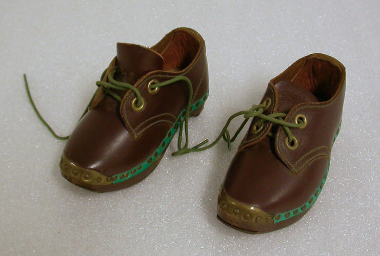Pair of miniature clogs with brown leather uppers and wooden soles. Strip of green plastic around shoe on top of sole. Wooden sole with metal strips on heel and sole. Green laces, four metal eyelets. Shoes unworn / unused.