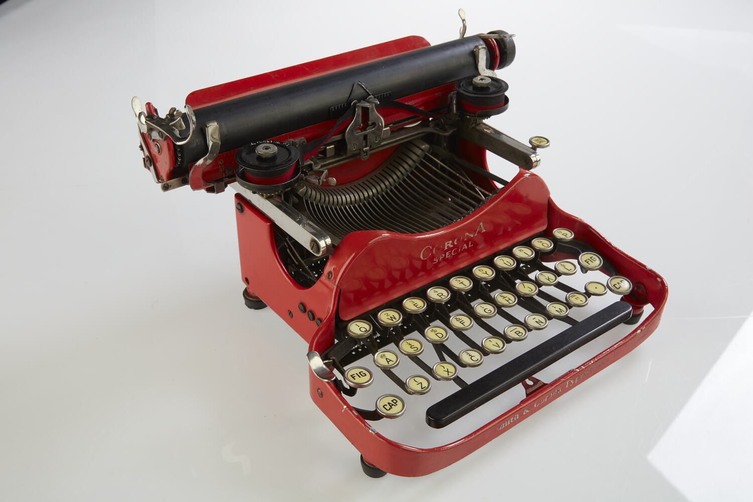 In the Model 3 the carriage, complete with platen and ribbon spools, folded forward over the keyboard to reduce the height and depth of the machine for portability. The Model 3 Special was produced in the 1920s and 1930s. It was available in a range of colours and had an improved keyboard. This particular machine is red and is complete with a leather-covered wooden case.