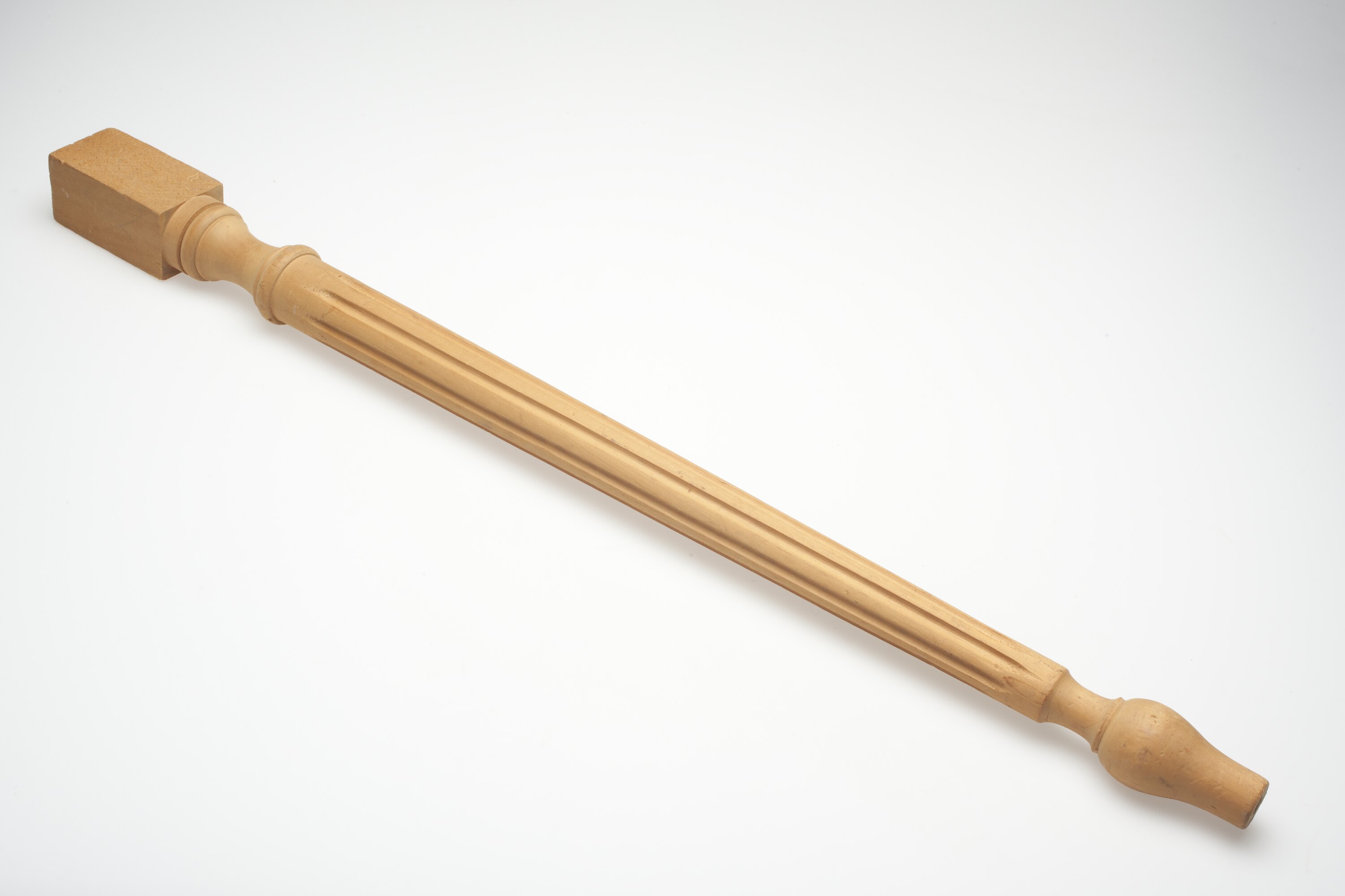 Long, elaborately turned piece with a square base and some turned curves further up. Main body consists of vertical grooves. There are some more turned curves at the top and this end tapers slightly.