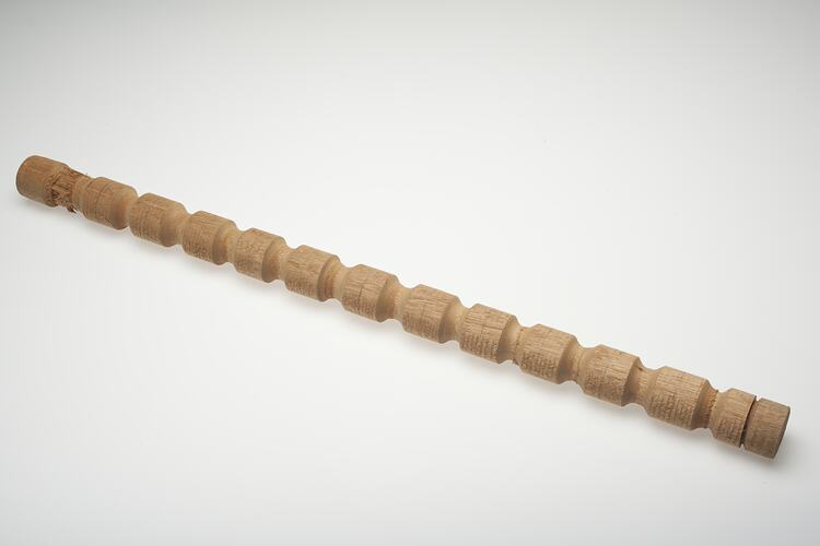Wooden furniture piece made by Adolph Bruhn & Son, circa 1970 - 1990. It was found in Area A at Adolph Bruhn & Son's Wood Turners Shop, 283 Coventry Street, South Melbourne. The business was established by Adolph Bruhn circa 1893 in Little Collins Street, Melbourne. Upon his death in 1919 it was then operated by Adolph's son Sophus Christopher Bruhn. Upon Sophus's death in 1959 his son Sophus Walter Bruhn took over the business. In 1970 Sophus reduced the scale of the business and relocated to South Melbourne. The business closed upon Sophus's death in January 1990.