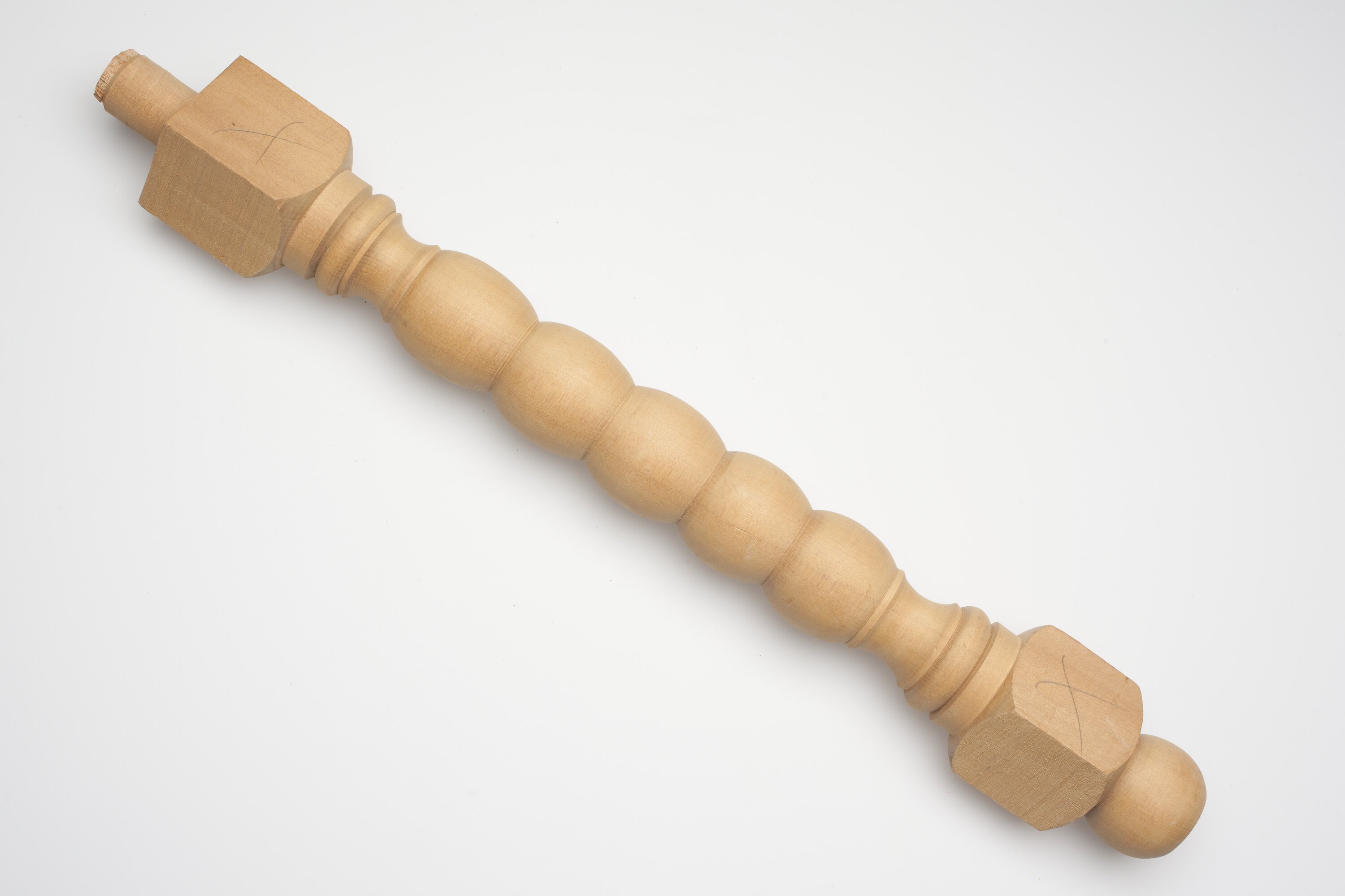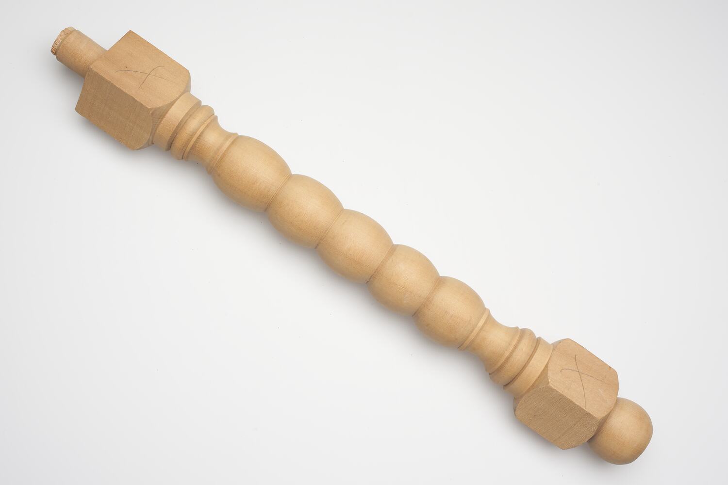 Furniture leg made from pale gold-coloured wood. Body is composed of a string of oblong-shaped forms with a rectangular segment on each end of the body. One end has cylindrical segment projecting from its centre and the other end is an oblong-shaped form.