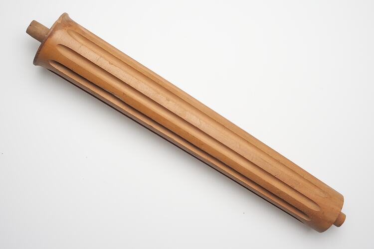 Rounded piece, turned along its length with grooves. At both ends there is a cylindrical projection. The piece tapers in at one end.
