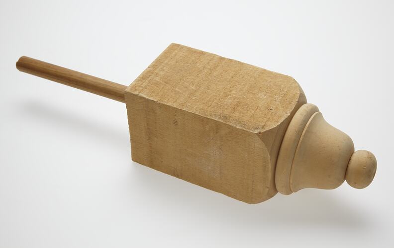 This piece appears to have been only partly worked. It consists of a block of wood one end of which is worked to appear as the top of the object. The worked part is bell-shaped, with a squat, rounded part on top. Protruding from the other end is a cylindrical rod.