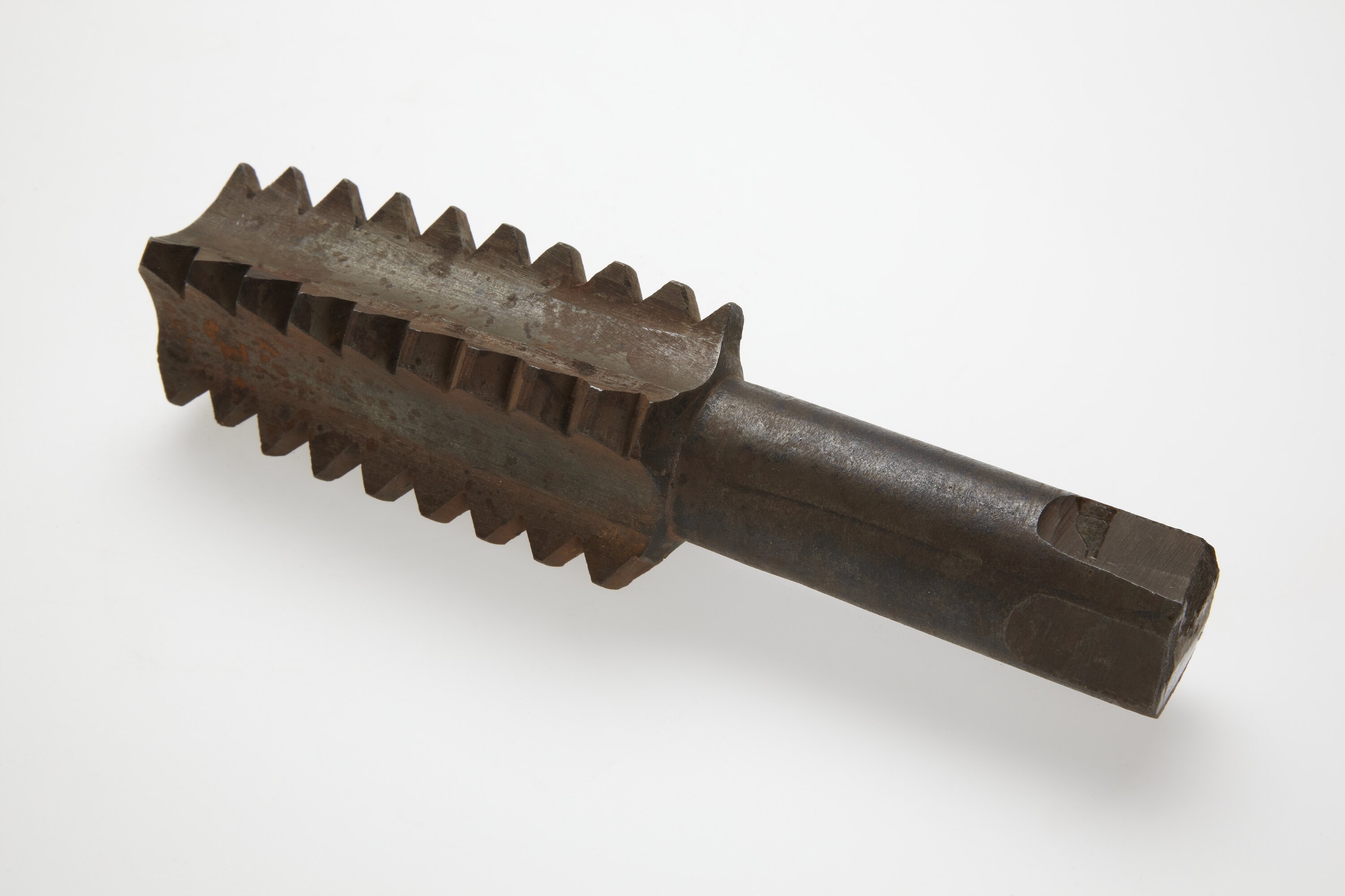 Object made from solid grey/silver metal with cylindrical handle which has been square at the end. The functional end is square and each corner has a projecting, saw-toothed blade. The teeth are massive and project out on a 45o angle to the handle. Top is flat and there is a circular hole in the centre, possibly for holding a pointed bit.