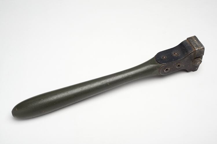 Wooden handle with dark green paint, with metal head attachment, fitted with a revolving wheel.