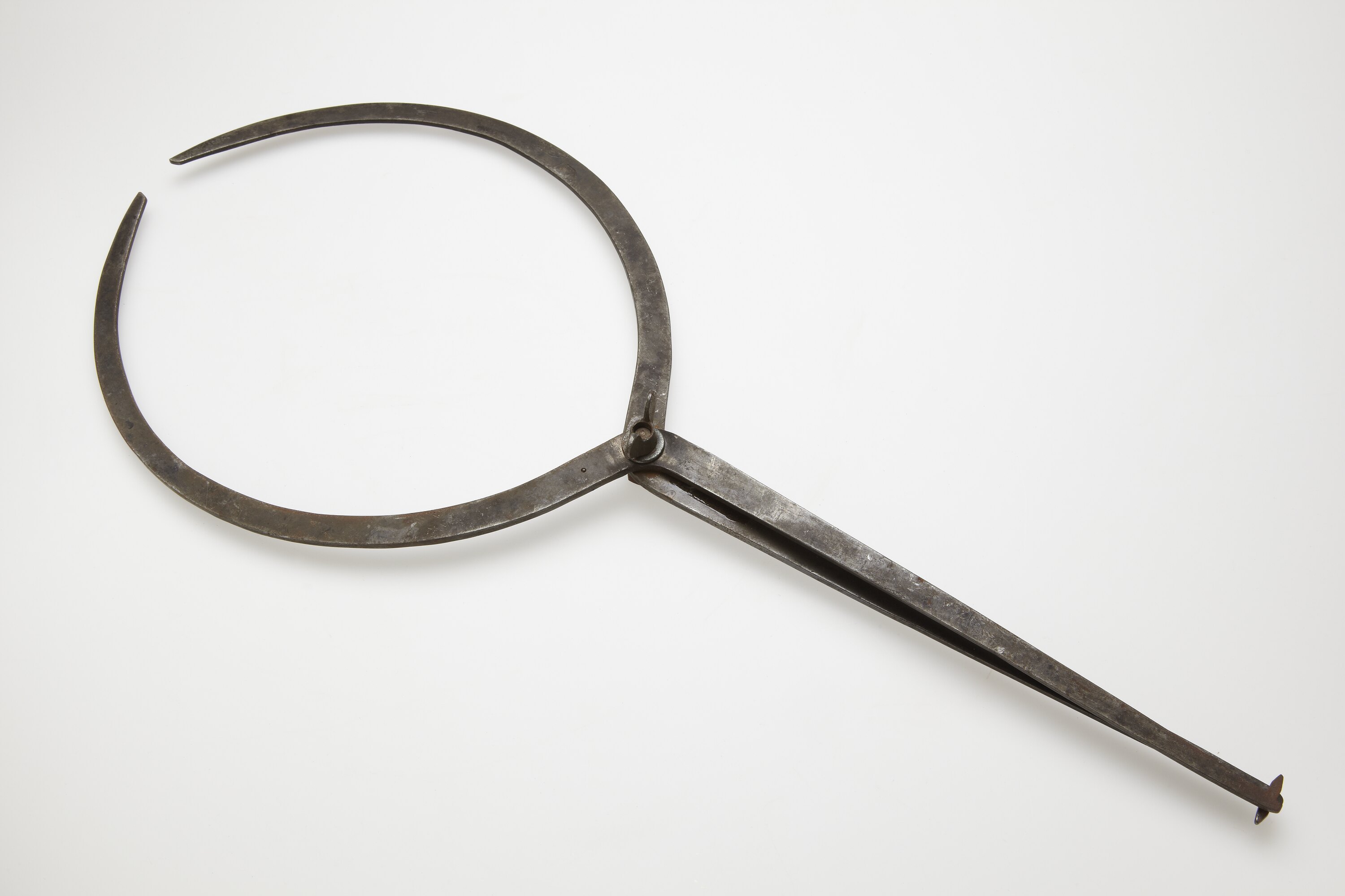 Metal calipers joined in middle with a wingnut and bolt. Above join arms are curved to form a circle. Below join arms are straight with outward facing points on either tip, at right angles to arm. Calipers move freely.