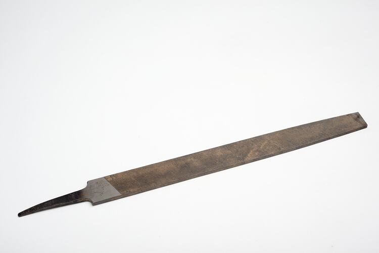 Mill File manufactured by Wiltshire, circa 1980s. It would have been used to sharpen cutting tools and was taken from Area D4 at Adolph Bruhn & Son's Wood Turners Shop, 283 Coventry Street, South Melbourne. The business was established by Adolph Bruhn circa 1893 in Little Collins Street, Melbourne. Upon his death in 1919 it was then operated by Adolph's son Sophus Christopher Bruhn. Upon Sophus's death in 1959 his son Sophus Walter Bruhn took over the business. In 1970 Sophus reduced the scale of the business and relocated to South Melbourne. The business closed upon Sophus's death in January 1990.