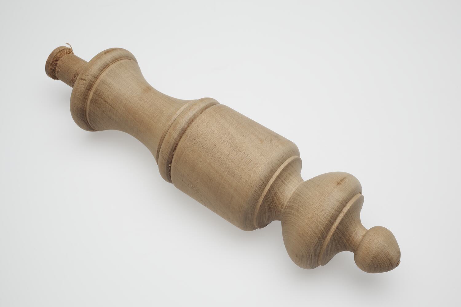 Furniture piece is short and made from pale gold-coloured wood. Top segment of body is shaped like a spinning top, central segment is cylindrical and bottom segment is shaped like a cotton reel. A short, cylindrical joining segment projects from the centre of the base.