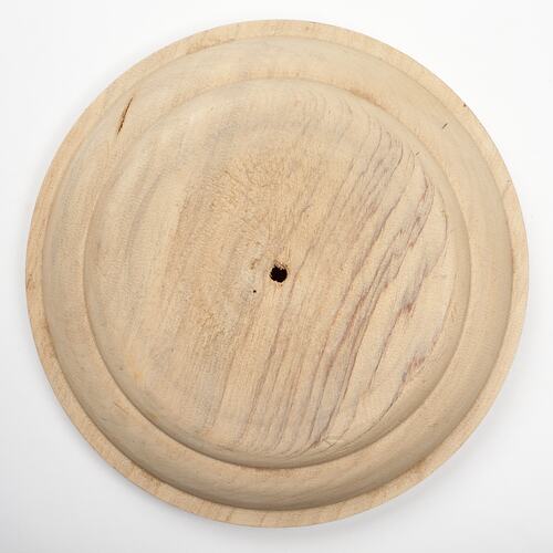 Round wooden base created by Adolph Bruhn & Son, circa 1975 - 1990. It was found in a pile of woodturned objects in Area B2 at Adolph Bruhn & Son's Wood Turners Shop, 283 Coventry Street, South Melbourne. The business was established by Adolph Bruhn circa 1893 in Little Collins Street, Melbourne. Upon his death in 1919 it was then operated by Adolph's son Sophus Christopher Bruhn. Upon Sophus's death in 1959 his son Sophus Walter Bruhn took over the business. In 1970 Sophus reduced the scale of the business and relocated to South Melbourne. The business closed upon Sophus's death in January 1990.