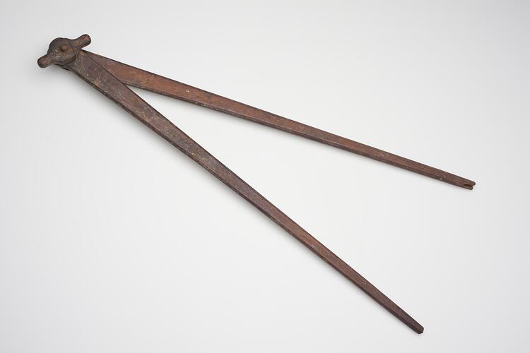 Two elongated pieces of wood screwed together. Both pieces are wider at the point where they join and taper towards their ends. At the top, the screw holding them together is held on the other side by a nut.