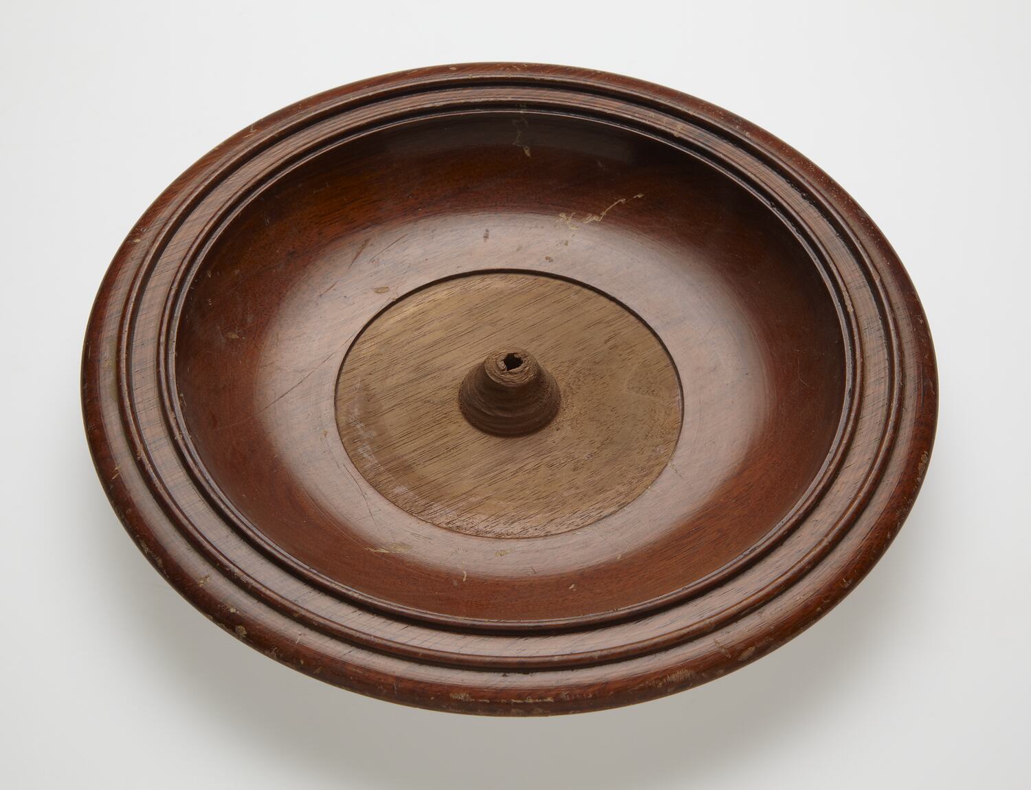 Unfinished collection plate created by Adolph Bruhn & Son, circa 1970 - 1990. It was taken from Area A at Adolph Bruhn & Son's Wood Turners Shop, 283 Coventry Street, South Melbourne. The business was established by Adolph Bruhn circa 1893 in Little Collins Street, Melbourne. Upon his death in 1919 it was then operated by Adolph's son Sophus Christopher Bruhn. Upon Sophus's death in 1959 his son Sophus Walter Bruhn took over the business. In 1970 Sophus reduced the scale of the business and relocated to South Melbourne. The business closed upon Sophus's death in January 1990.