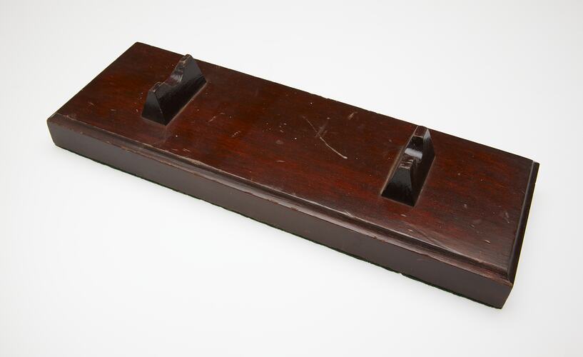 Holder made of glossy, varnished, rich dark brown-coloured wood. Holder is rectangular in shape and has a grooved rim. Two solid triangular pieces of wood, with concave depressions present in centre of the top, are situated near each end of the rectangular top. Underside of holder is covered with a piece of felt.