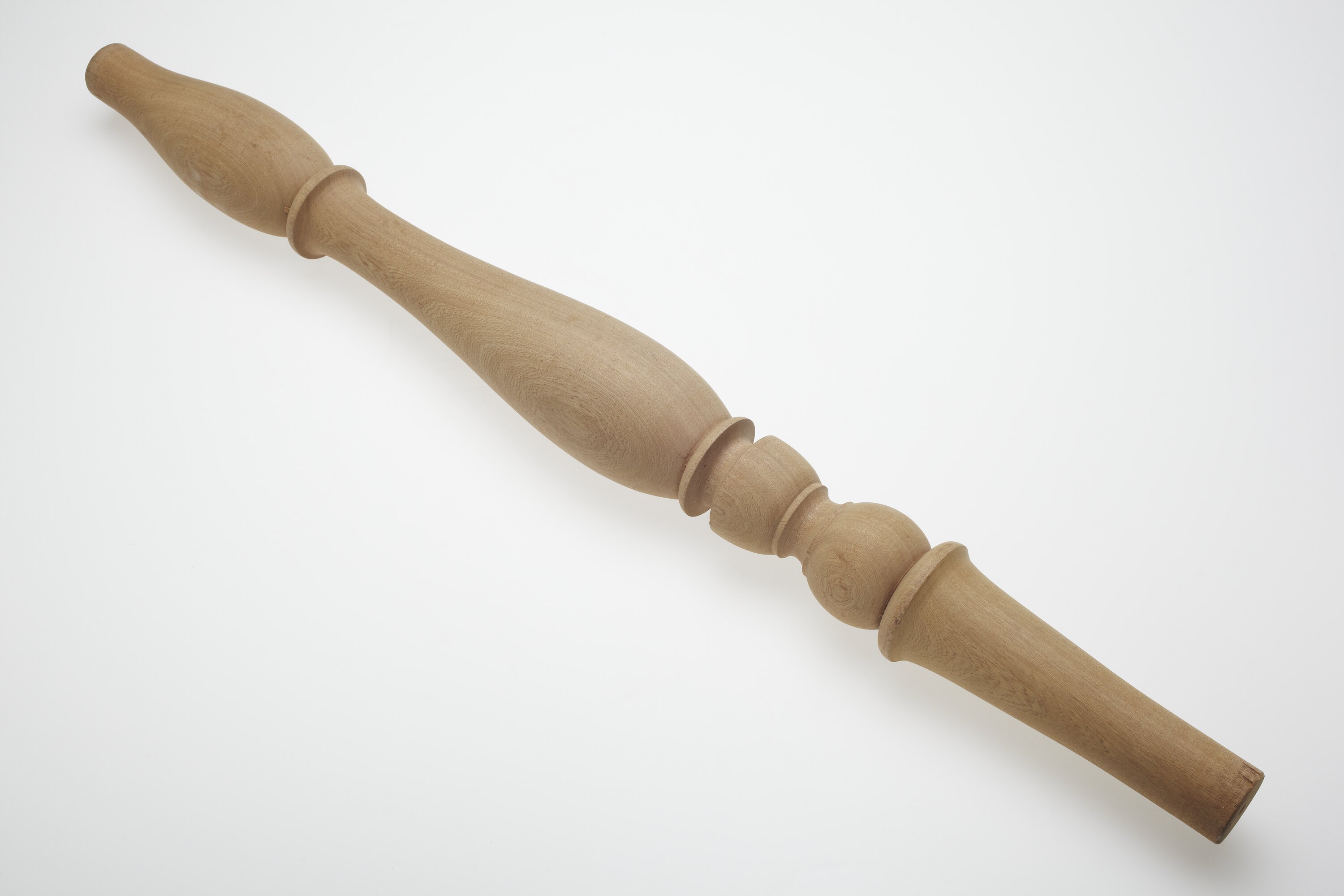 Furniture piece elaborately turned along its whole length. The ends taper slightly in comparison with some wide curves along the length.