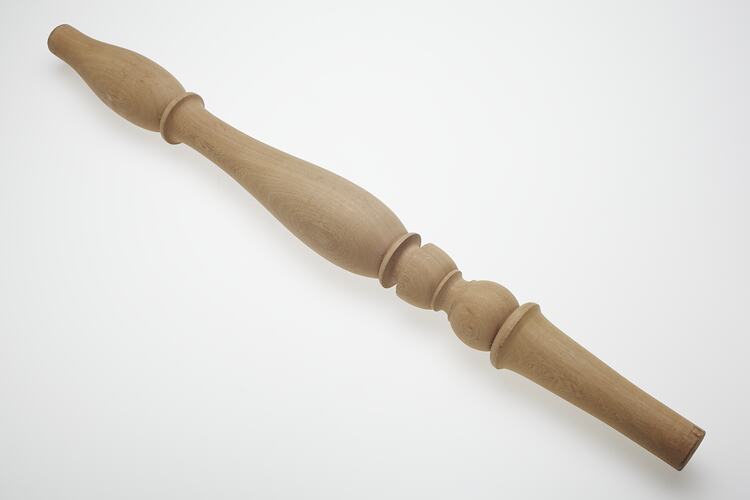 Wooden furniture piece created by Adolph Bruhn & Son, circa 1970 - 1990. It was found in Area A at Adolph Bruhn & Son's Wood Turners Shop, 283 Coventry Street, South Melbourne. The business was established by Adolph Bruhn circa 1893 in Little Collins Street, Melbourne. Upon his death in 1919 it was then operated by Adolph's son Sophus Christopher Bruhn. Upon Sophus's death in 1959 his son Sophus Walter Bruhn took over the business. In 1970 Sophus reduced the scale of the business and relocated to South Melbourne. The business closed upon Sophus's death in January 1990.