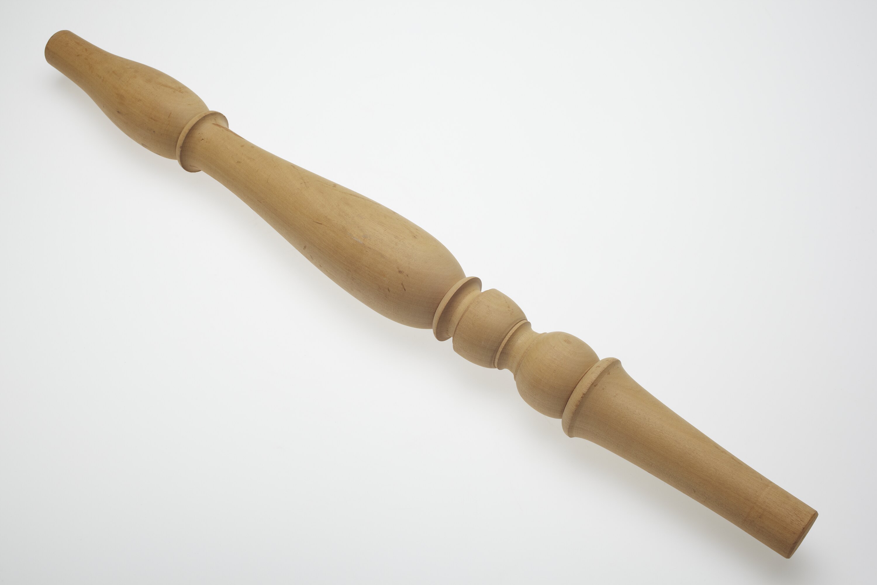 Furniture piece elaborately turned along its whole length. The ends taper slightly in comparison with some wide curves along the length.
