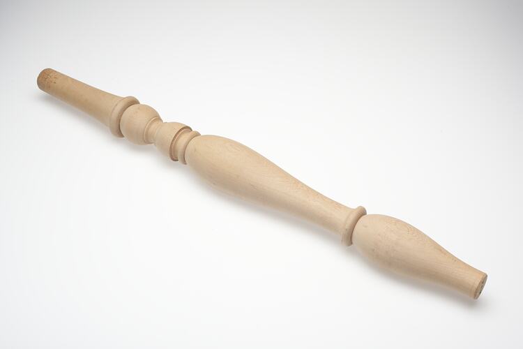 Wooden furniture piece created by Adolph Bruhn & Son, circa 1970 - 1990. It was found in Area A at Adolph Bruhn & Son's Wood Turners Shop, 283 Coventry Street, South Melbourne. The business was established by Adolph Bruhn circa 1893 in Little Collins Street, Melbourne. Upon his death in 1919 it was then operated by Adolph's son Sophus Christopher Bruhn. Upon Sophus's death in 1959 his son Sophus Walter Bruhn took over the business. In 1970 Sophus reduced the scale of the business and relocated to South Melbourne. The business closed upon Sophus's death in January 1990.