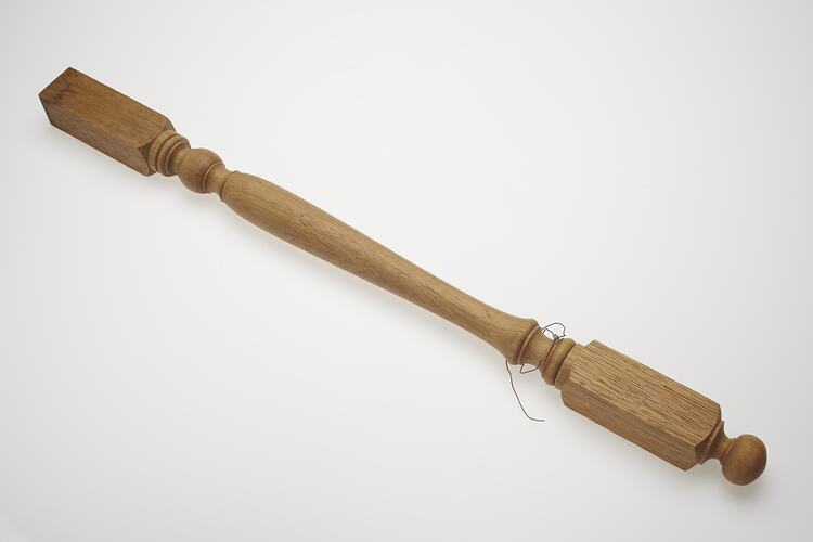 Wooden furniture piece made by Adolph Bruhn & Son, circa 1970 - 1990. It was found in Area A at Adolph Bruhn & Son's Wood Turners Shop, 283 Coventry Street, South Melbourne. The business was established by Adolph Bruhn circa 1893 in Little Collins Street, Melbourne. Upon his death in 1919 it was then operated by Adolph's son Sophus Christopher Bruhn. Upon Sophus's death in 1959 his son Sophus Walter Bruhn took over the business. In 1970 Sophus reduced the scale of the business and relocated to South Melbourne. The business closed upon Sophus's death in January 1990.