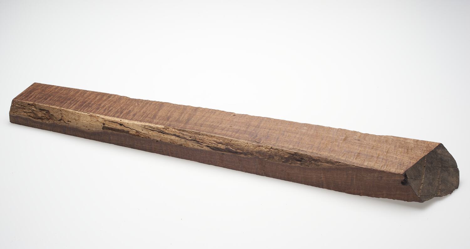 Unworked piece of timber held in the shop of Adolph Bruhn & Son, circa 1970 - 1990. It was taken from Area A at Adolph Bruhn & Son's Wood Turners Shop, 283 Coventry Street, South Melbourne. The business was established by Adolph Bruhn circa 1893 in Little Collins Street, Melbourne. Upon his death in 1919 it was then operated by Adolph's son Sophus Christopher Bruhn. Upon Sophus's death in 1959 his son Sophus Walter Bruhn took over the business. In 1970 Sophus reduced the scale of the business and relocated to South Melbourne. The business closed upon Sophus's death in January 1990.