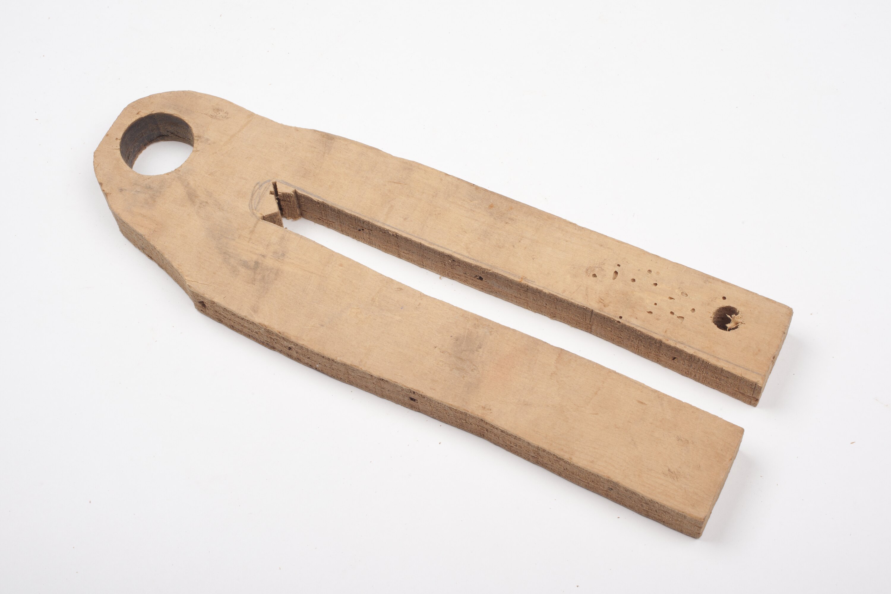 Long rectangular piece of wood rounded at one end with a hole at rounded end and small hole at opposite end. There is a cut up the centre.