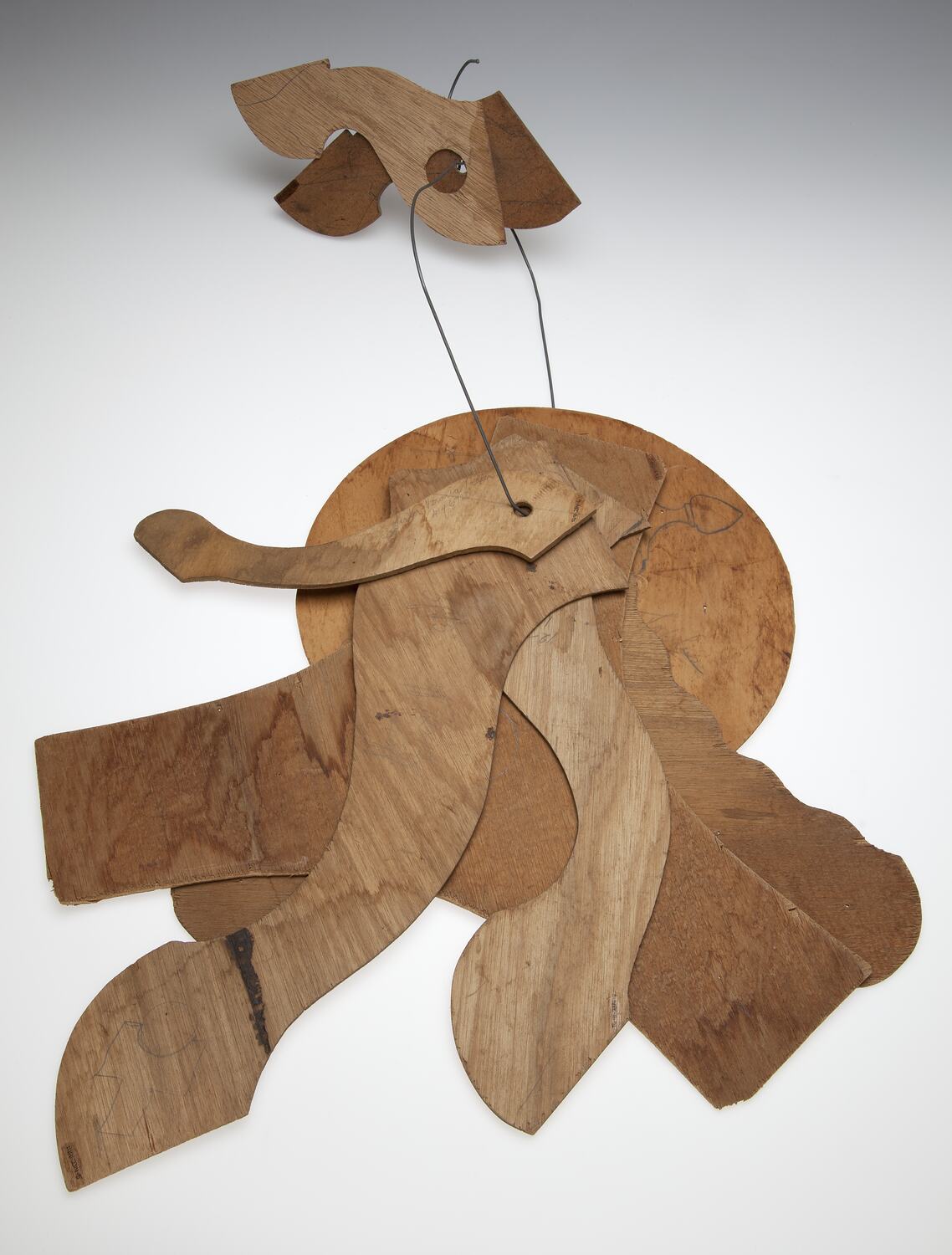 Eight woodturning patterns in varying sizes and shapes. Three pieces are patterns for making a billiard cue rack for Alcock, Thompson & Taylor of South Melbourne. Other pieces appear to be feet for a small table. Each piece of wood has a hole in one end so they can be put on the wire hanger.