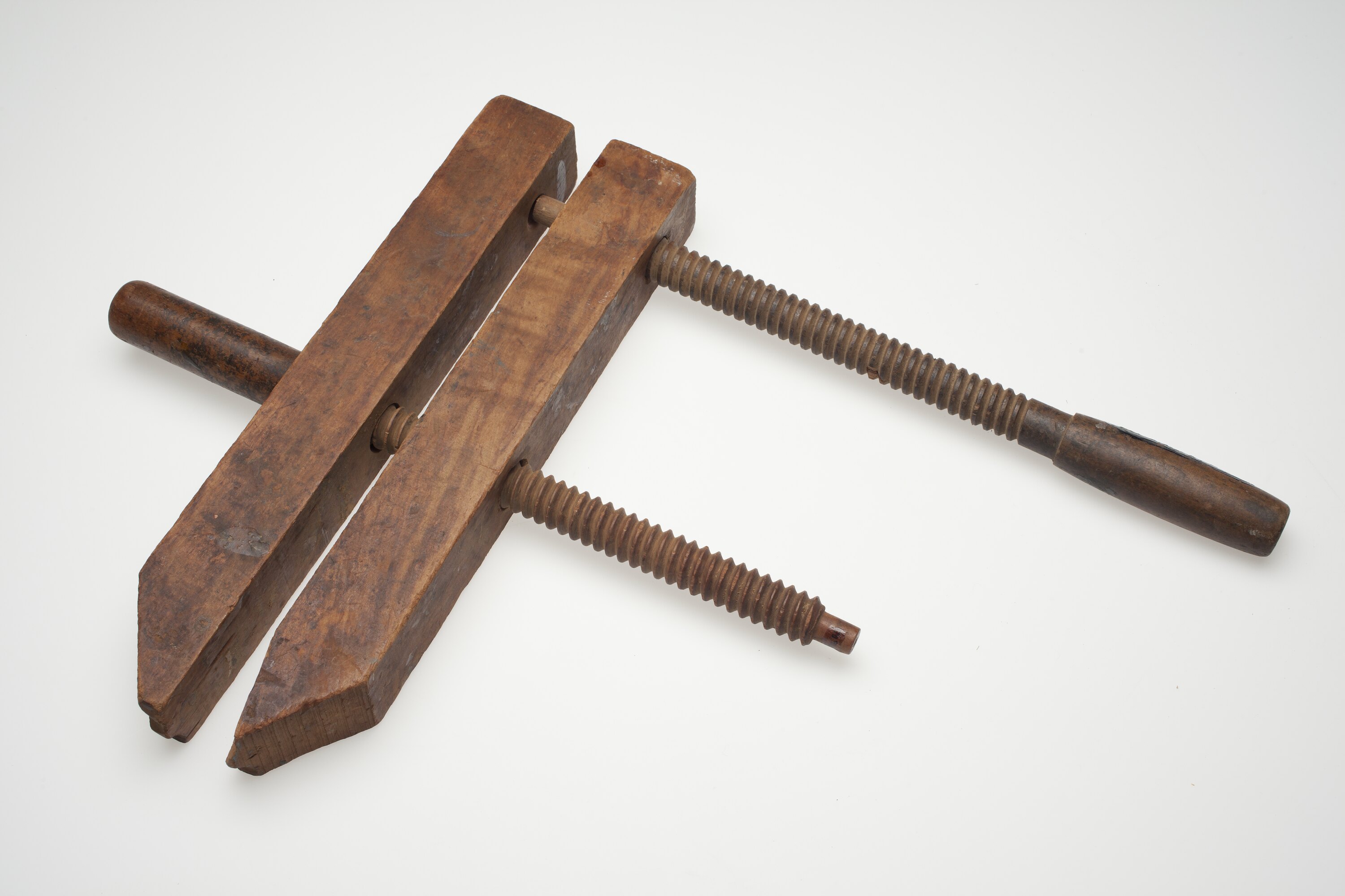Hand screw made up of two wooden lengths with smooth handles for one-third of length, screw pattern for remainder of length, and small smooth end at end of screw. These two parts screw through the other lengths horizontally. Then there are two rectangular wooden lengths which taper off at an angle on one side at one end, with one screw hole in middle of length and half a hole towards non-tapered end. At end of tapered length are two inward arcs.