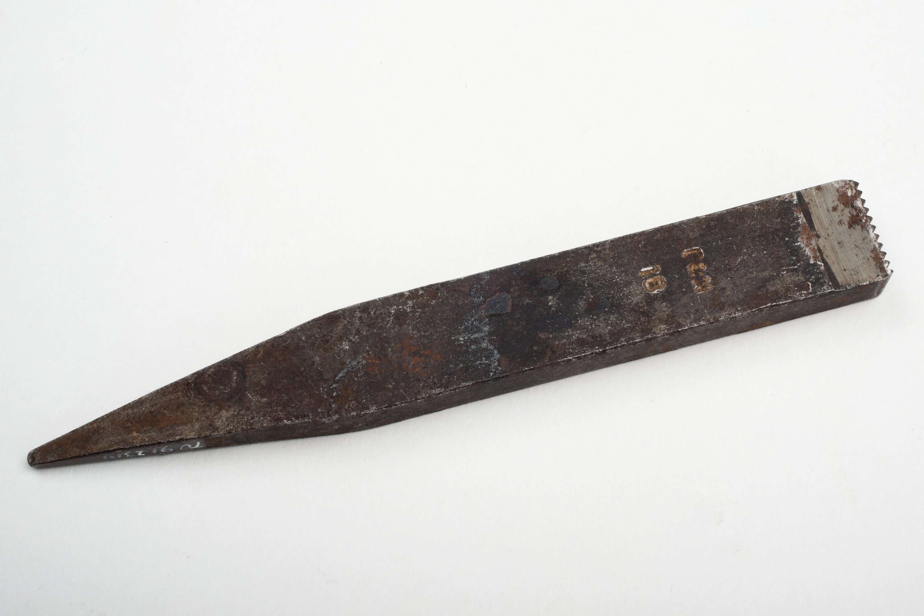 Scraper circa 1890s-1950s. It was found in Area B1 at Adolph Bruhn & Son's Wood Turners Shop, 283 Coventry Street, South Melbourne. The business was established by Adolph Bruhn circa 1893 in Little Collins Street, Melbourne. Upon his death in 1919 it was then operated by Adolph's son Sophus Christopher Bruhn. Upon Sophus's death in 1959 his son Sophus Walter Bruhn took over the business. In 1970 Sophus reduced the scale of the business and relocated to South Melbourne. The business closed upon Sophus's death in January 1990.