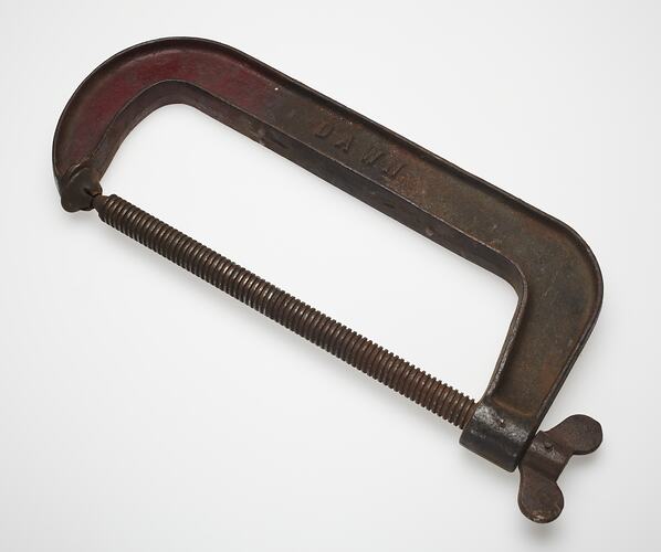 G Clamp made by Dawn circa 1900s-1950s. It was found in Area E4 at Adolph Bruhn & Son's Wood Turners Shop, 283 Coventry Street, South Melbourne. The business was established by Adolph Bruhn circa 1893 in Little Collins Street, Melbourne. Upon his death in 1919 it was then operated by Adolph's son Sophus Christopher Bruhn. Upon Sophus's death in 1959 his son Sophus Walter Bruhn took over the business. In 1970 Sophus reduced the scale of the business and relocated to South Melbourne. The business closed upon Sophus's death in January 1990.