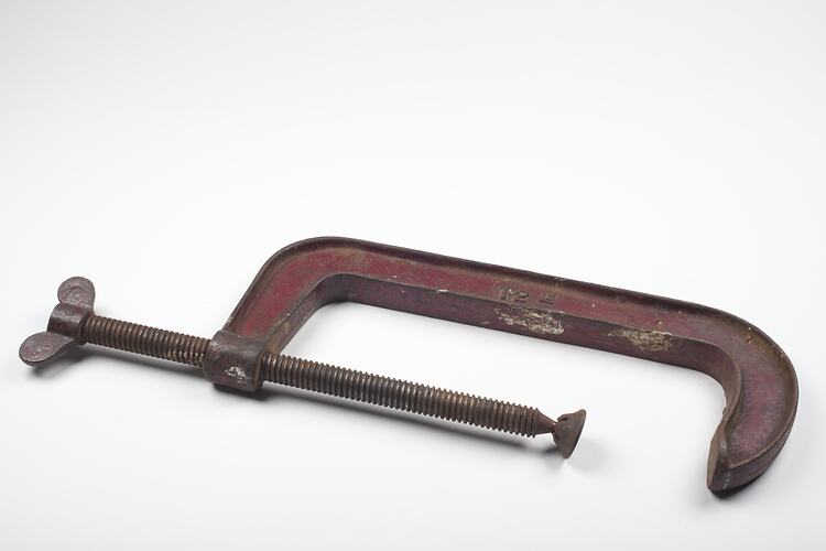 G Clamp made by Dawn circa 1900s-1950s. It was found in Area E4 at Adolph Bruhn & Son's Wood Turners Shop, 283 Coventry Street, South Melbourne. The business was established by Adolph Bruhn circa 1893 in Little Collins Street, Melbourne. Upon his death in 1919 it was then operated by Adolph's son Sophus Christopher Bruhn. Upon Sophus's death in 1959 his son Sophus Walter Bruhn took over the business. In 1970 Sophus reduced the scale of the business and relocated to South Melbourne. The business closed upon Sophus's death in January 1990.