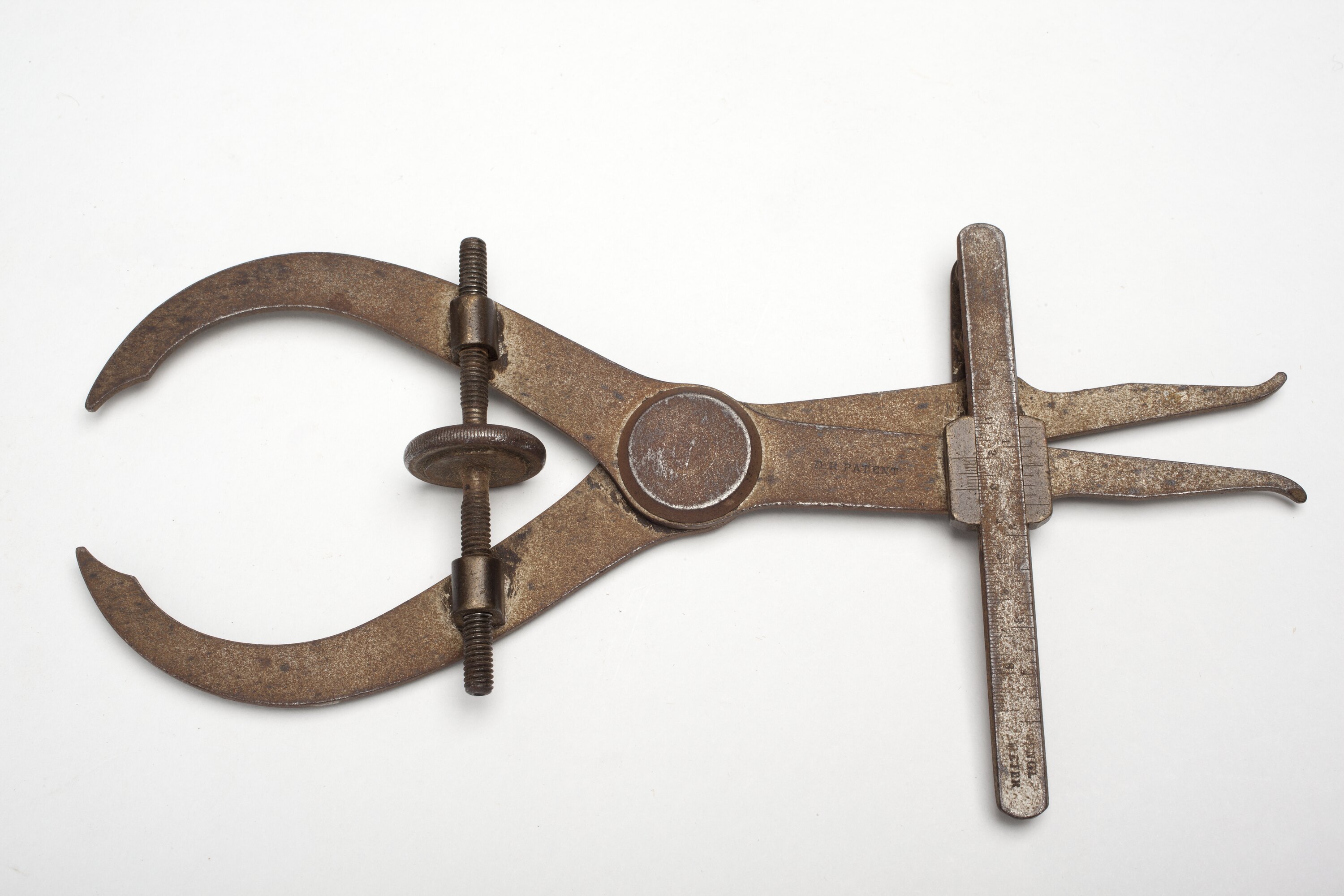 Steel double caliper with a pair of straight legs for taking inside measurements and curved legs for outside measurements. The caliper legs are held in position by a hinge pin and adjusted to size by a nut and screw.