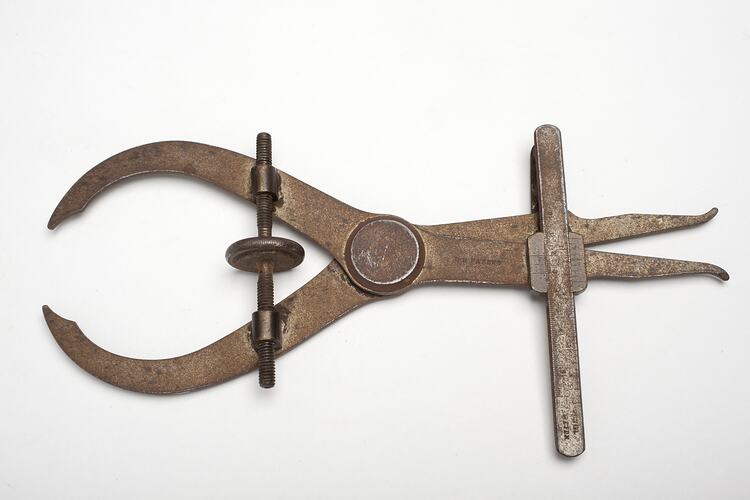 Double Steel Calipers circa 1900s - 1940s. They were found in Area B1 at Adolph Bruhn & Son's Wood Turners Shop, 283 Coventry Street, South Melbourne. The business was established by Adolph Bruhn circa 1893 in Little Collins Street, Melbourne. Upon his death in 1919 it was then operated by Adolph's son Sophus Christopher Bruhn. Upon Sophus's death in 1959 his son Sophus Walter Bruhn took over the business. In 1970 Sophus reduced the scale of the business and relocated to South Melbourne. The business closed upon Sophus's death in January 1990.