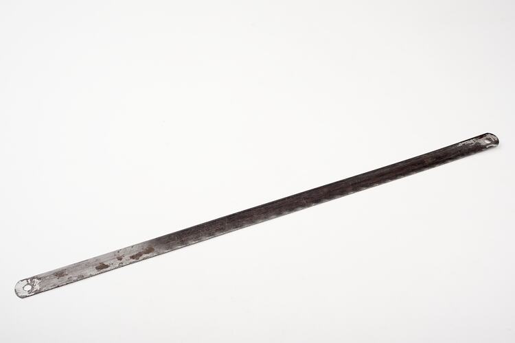 Hacksaw blade circa 1900s-1960s. It was found in Area B1 at Adolph Bruhn & Son's Wood Turners Shop, 283 Coventry Street, South Melbourne. The business was established by Adolph Bruhn circa 1893 in Little Collins Street, Melbourne. Upon his death in 1919 it was then operated by Adolph's son Sophus Christopher Bruhn. Upon Sophus's death in 1959 his son Sophus Walter Bruhn took over the business. In 1970 Sophus reduced the scale of the business and relocated to South Melbourne. The business closed upon Sophus's death in January 1990.