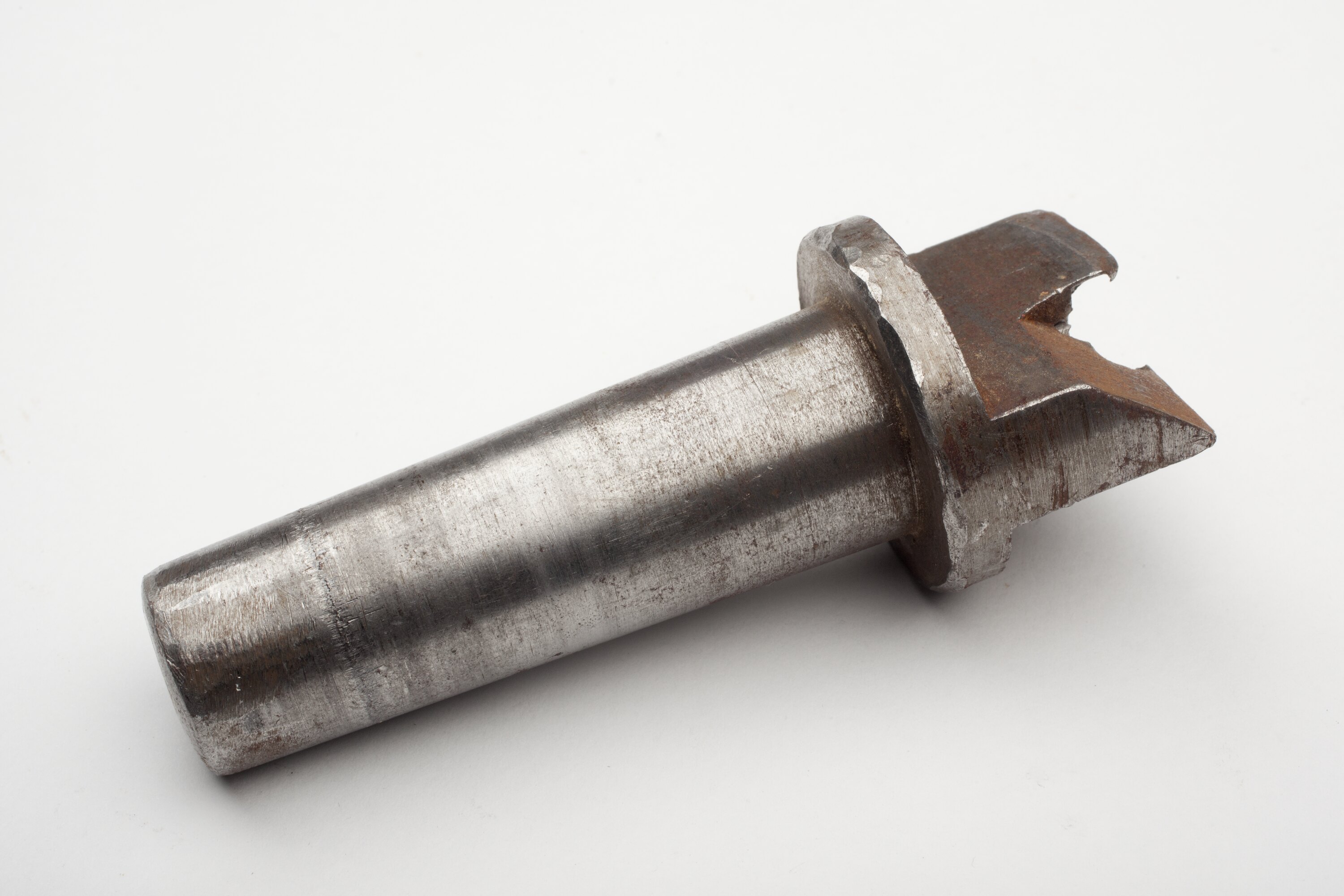 Round metal length, flaring outwards one end, with jagged sharp protruding piece.