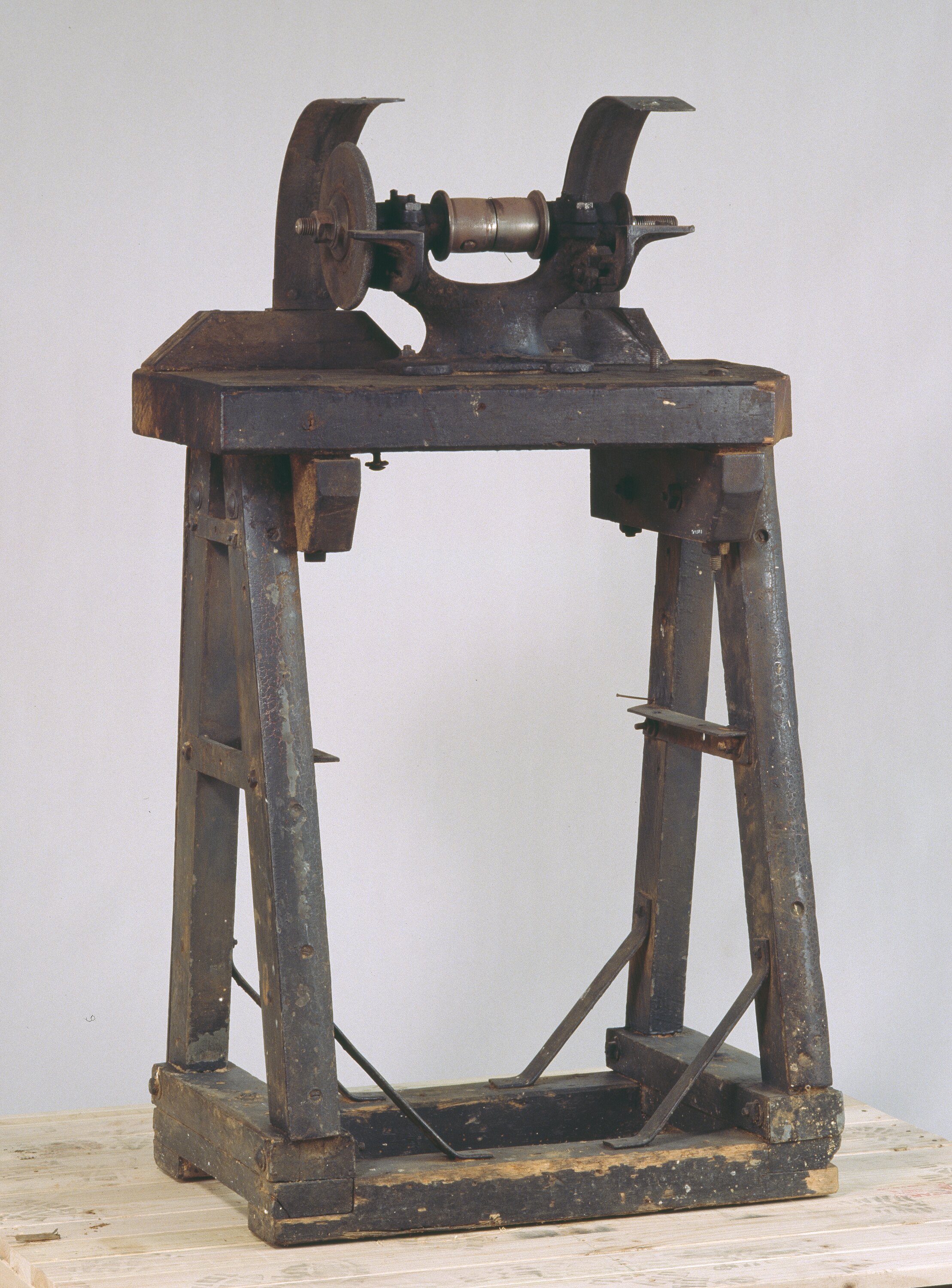 Grinder, circa 1930-1960. It was taken from Adolph Bruhn & Son's Wood Turners Shop, 283 Coventry Street, South Melbourne. The business was established by Adolph Bruhn circa 1893 in Little Collins Street, Melbourne. Upon his death in 1919 it was then operated by Adolph's son Sophus Christopher Bruhn. Upon Sophus's death in 1959 his son Sophus Walter Bruhn took over the business. In 1970 Sophus reduced the scale of the business and relocated to South Melbourne. The business closed upon Sophus's death in January 1990.