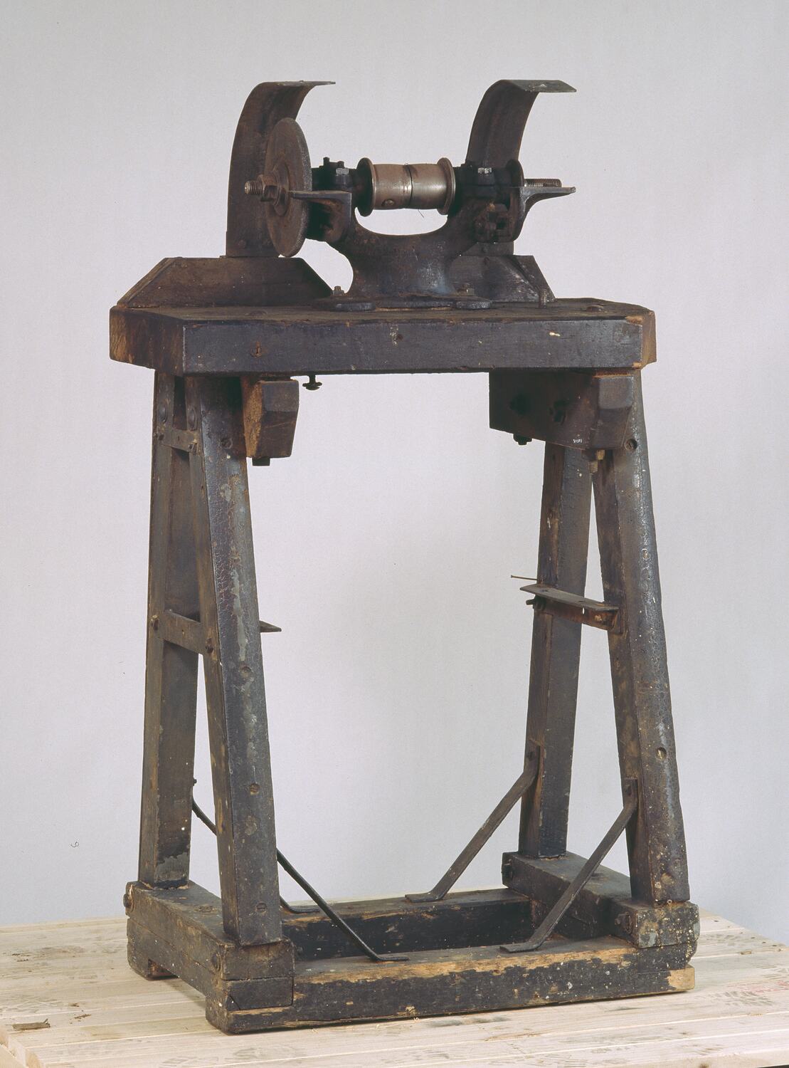 Grinder on wooden stand painted black. The grinder, made of metal probably cast iron, has been bolted to the top of the bench, there are two curved pieces of metal, each with a hole in the top attached to the back of the wooden stand on either side of the grinder.