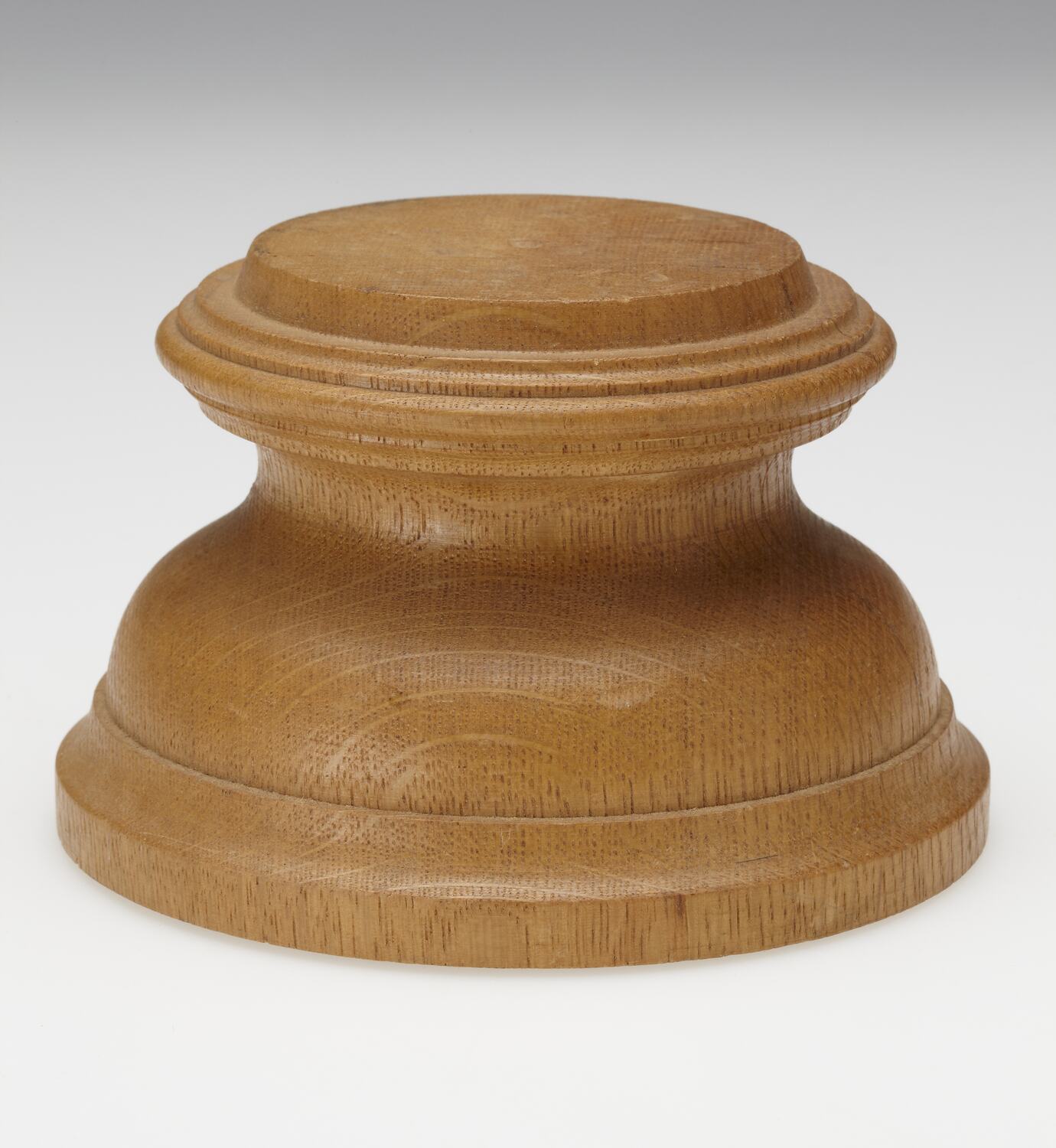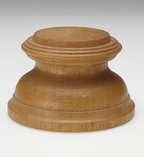 Turned wooden base created by Adolph Bruhn & Son, circa 1970 - 1990. It was found in a pile of woodturned products in Area B2 at Adolph Bruhn & Son's Wood Turners Shop, 283 Coventry Street, South Melbourne. The business was established by Adolph Bruhn circa 1893 in Little Collins Street, Melbourne. Upon his death in 1919 it was then operated by Adolph's son Sophus Christopher Bruhn. Upon Sophus's death in 1959 his son Sophus Walter Bruhn took over the business. In 1970 Sophus reduced the scale of the business and relocated to South Melbourne. The business closed upon Sophus's death in January 1990.