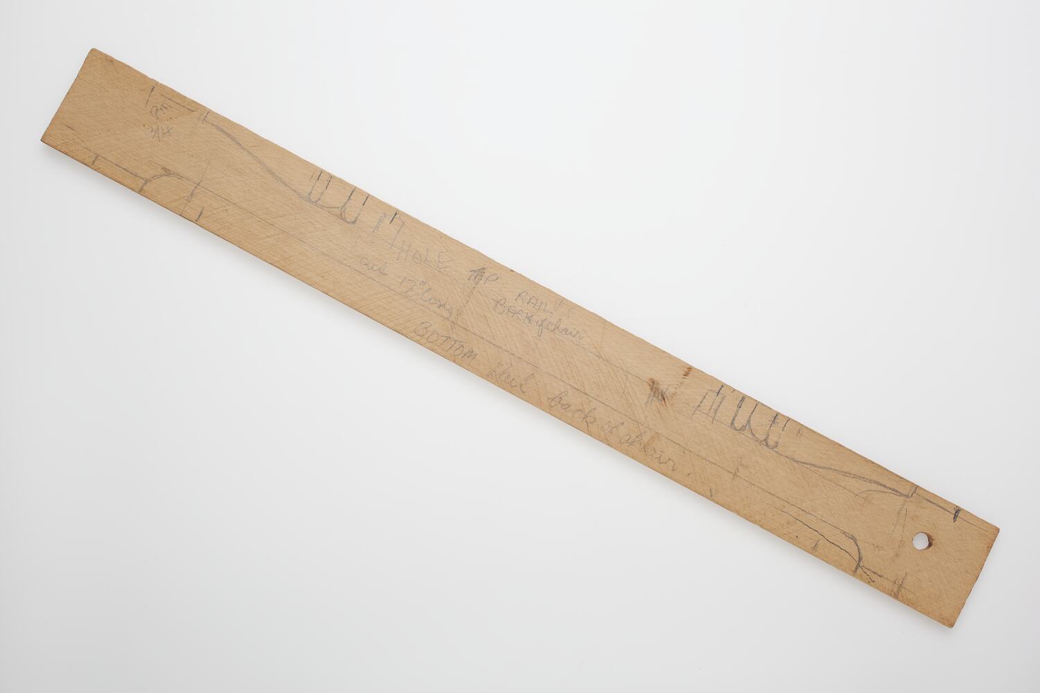 Inscribed front: HOLE TO RAIL/BACK OF CHAIR/cut 17" long/Bottom Rail back of chair/Pin/ 3/4.