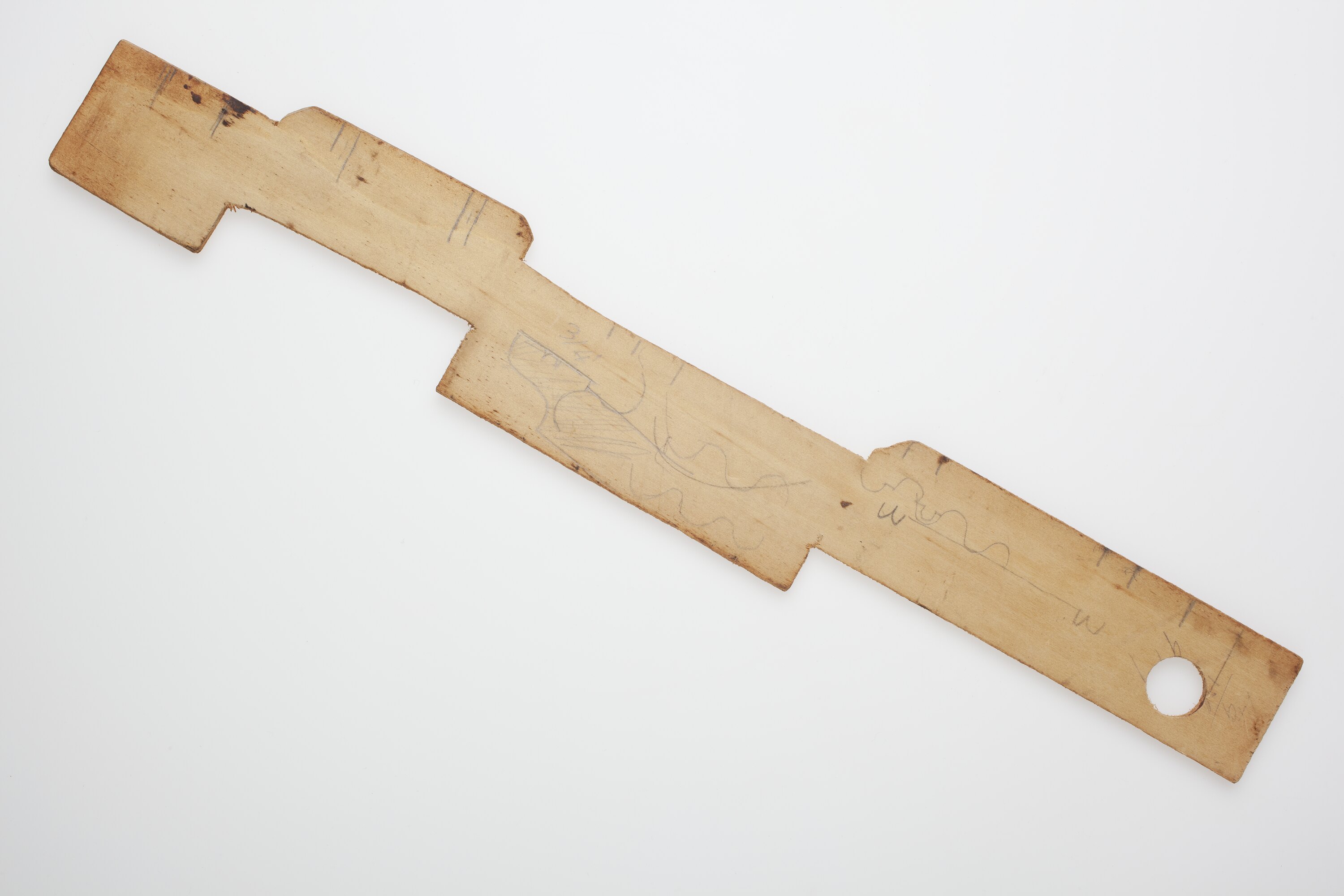 Template made from a pale gold-coloured wood and comprised of four rectangular shapes joined to each other at opposite corners. Both sides of the templet have pencil drawings, measuring marks and measurements. A circular hole has been cut in the centre of the top end of the templet.