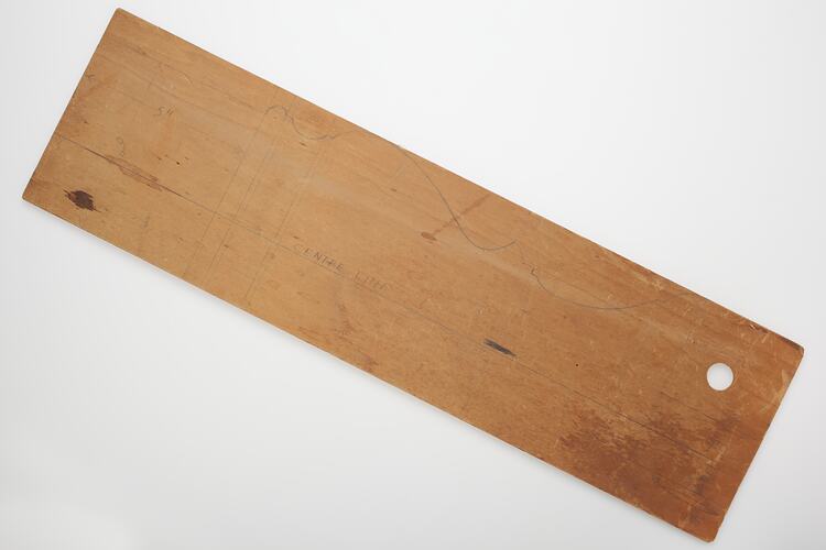Woodturning template created by Adolph Bruhn & Son, circa 1970 - 1990. It was found hanging from the wall in Area A at Adolph Bruhn & Son's Wood Turners Shop, 283 Coventry Street, South Melbourne. The business was established by Adolph Bruhn circa 1893 in Little Collins Street, Melbourne. Upon his death in 1919 it was then operated by Adolph's son Sophus Christopher Bruhn. Upon Sophus's death in 1959 his son Sophus Walter Bruhn took over the business. In 1970 Sophus reduced the scale of the business and relocated to South Melbourne. The business closed upon Sophus's death in January 1990.