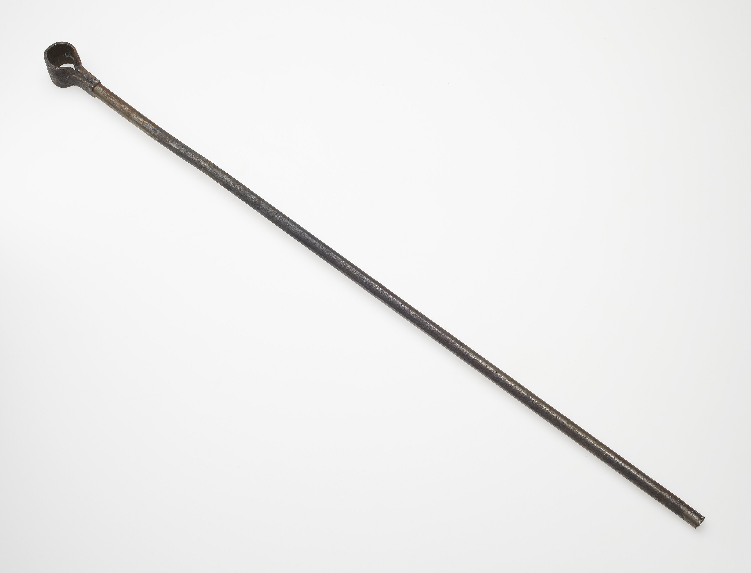 Solid metal shaft with collar at one end to take a removable handle and blunt functional end with raised segment in tip surface. Tool was used to bore holes into wood either by hand or in conjunction with the lathe. Use wear is present on the functional end and cuts have been made at regular intervals along the shaft which may represent measuring marks.