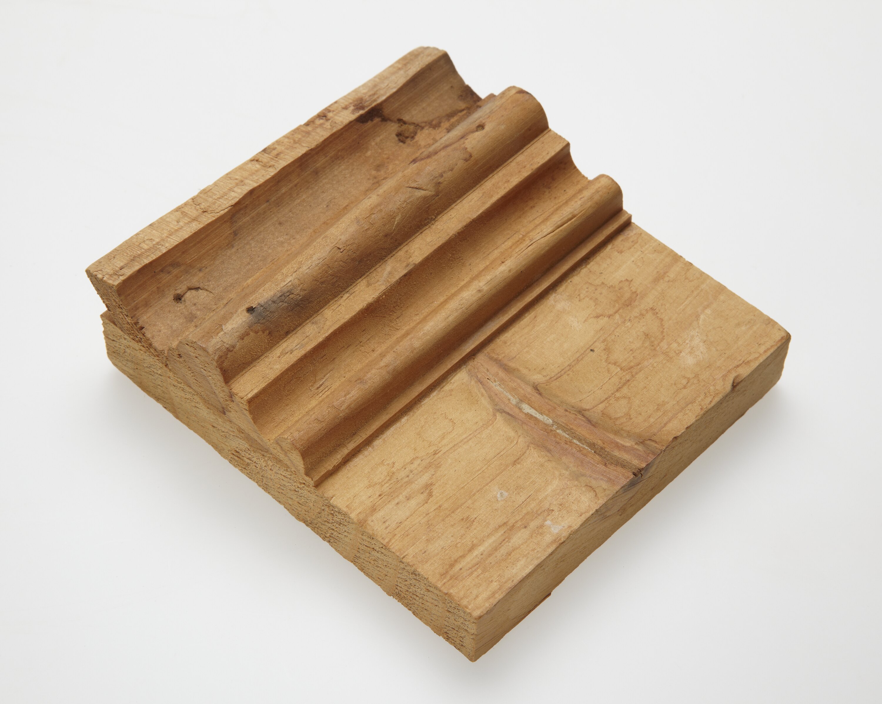 Rectangular piece of pale gold-coloured wood with two separate grooved and rounded pieces of wood glued to the lower half of one side. Two nail points project from each side of the back of item which looks as though it was constructed to demonstrate a specific woodturned style and/or product.