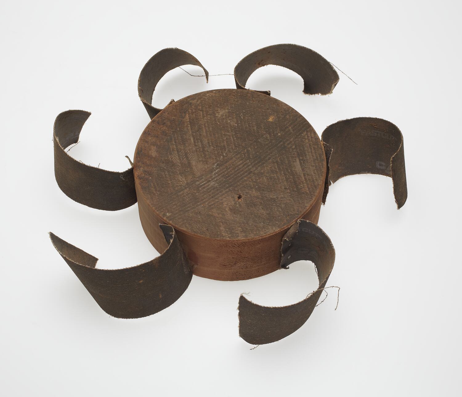 Disc-shaped piece of wood made from pink-/brown-coloured wood with strips of dark brown sandpaper nailed and glued to the surface of the side at regular intervals. Sandpaper curls out from the side of the disc and has white print on the back surface.