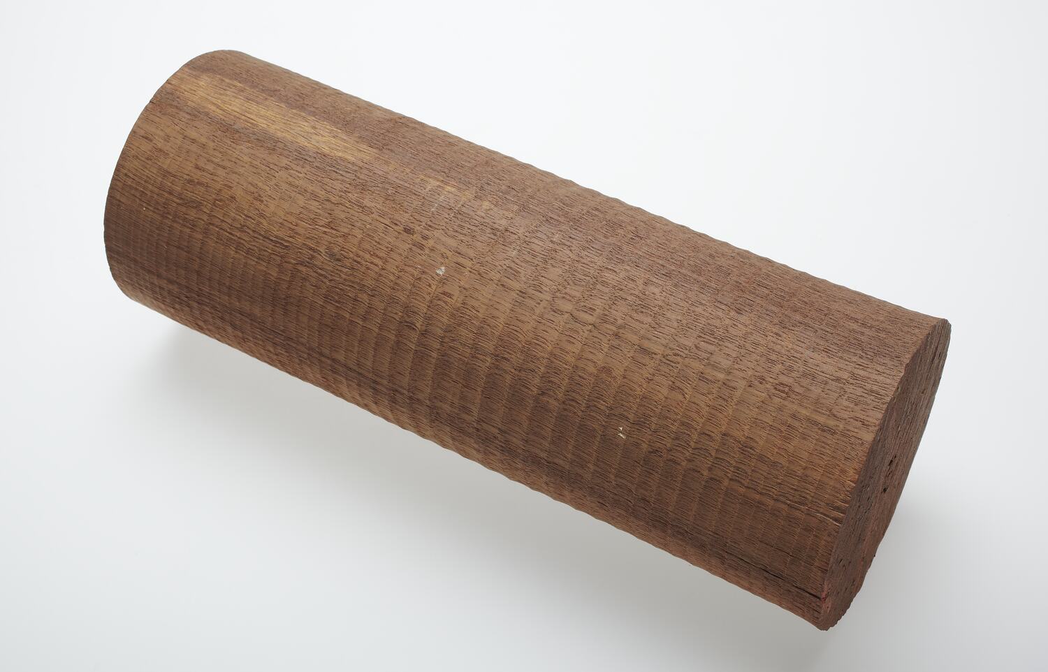Unidentifiable, unfinished, cylindrical piece of red-coloured wood. Raised ridges encircle cylinder at regular intervals. Smooth, shaven surfaces run vertically across the surface of object in places.