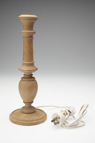 Wooden lamp base created by Adolph Bruhn & Son, circa 1970 - 1990. It was taken from Area A at Adolph Bruhn & Son's Wood Turners Shop, 283 Coventry Street, South Melbourne. The business was established by Adolph Bruhn circa 1893 in Little Collins Street, Melbourne. Upon his death in 1919 it was then operated by Adolph's son Sophus Christopher Bruhn. Upon Sophus's death in 1959 his son Sophus Walter Bruhn took over the business. In 1970 Sophus reduced the scale of the business and relocated to South Melbourne. The business closed upon Sophus's death in January 1990.