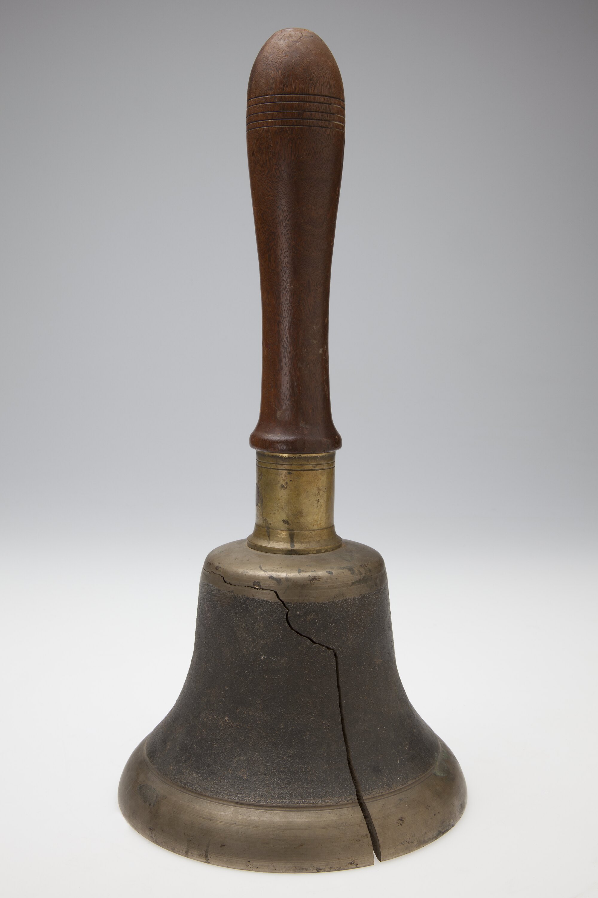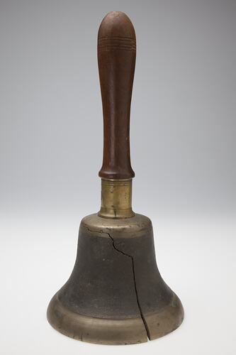 Hand bell with wooden handle made by Adolph Bruhn & Son, circa 1870s-1950s. It was taken from Area A at Adolph Bruhn & Son's Wood Turners Shop, 283 Coventry Street, South Melbourne. The business was established by Adolph Bruhn circa 1893 in Little Collins Street, Melbourne. Upon his death in 1919 it was then operated by Adolph's son Sophus Christopher Bruhn. Upon Sophus's death in 1959 his son Sophus Walter Bruhn took over the business. In 1970 Sophus reduced the scale of the business and relocated to South Melbourne. The business closed upon Sophus's death in January 1990.