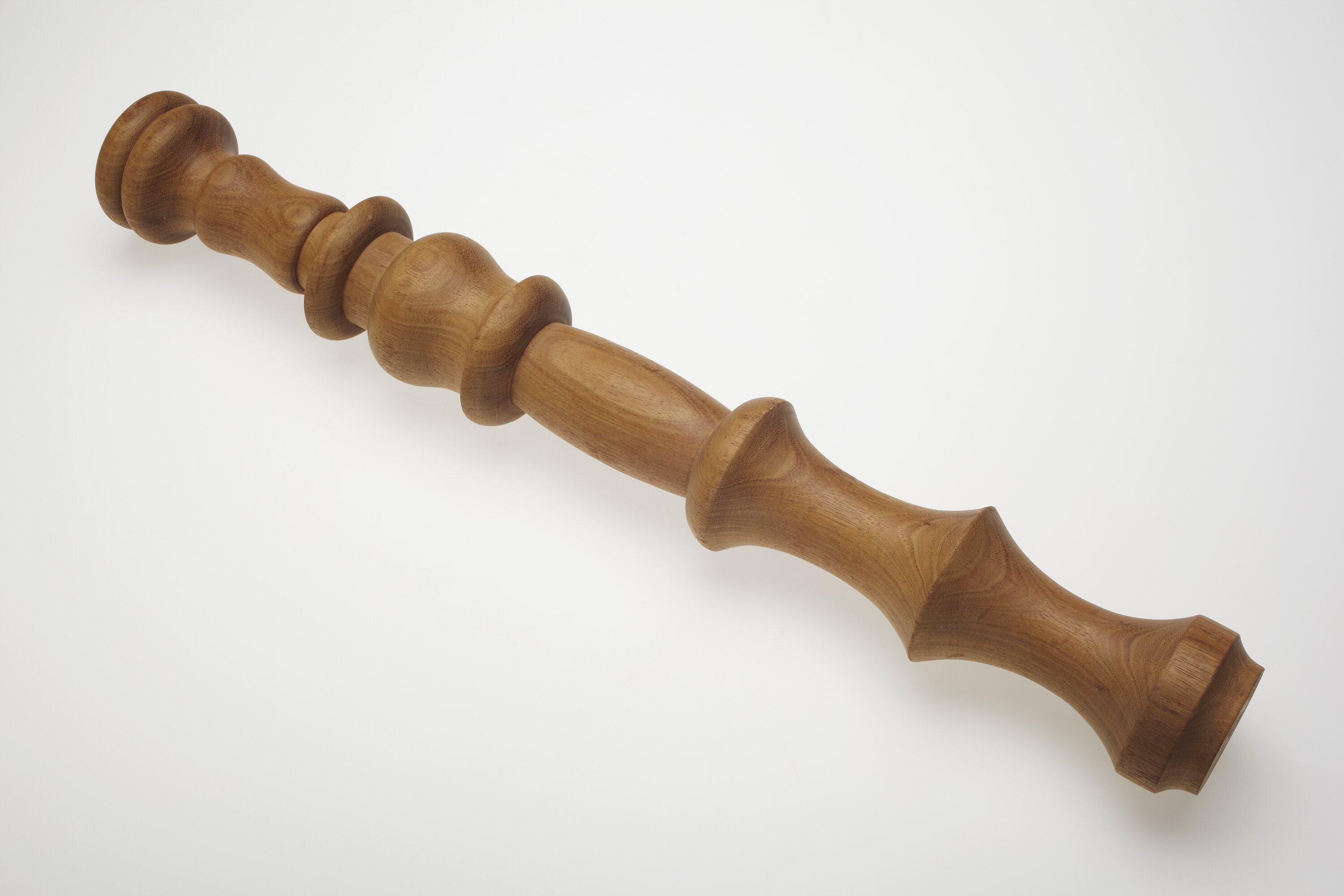 Furniture leg made from hazelnut-coloured wood which is elaborately turned with numerous grooves that vary in width, depth and shape. Both ends are flat and circular.
