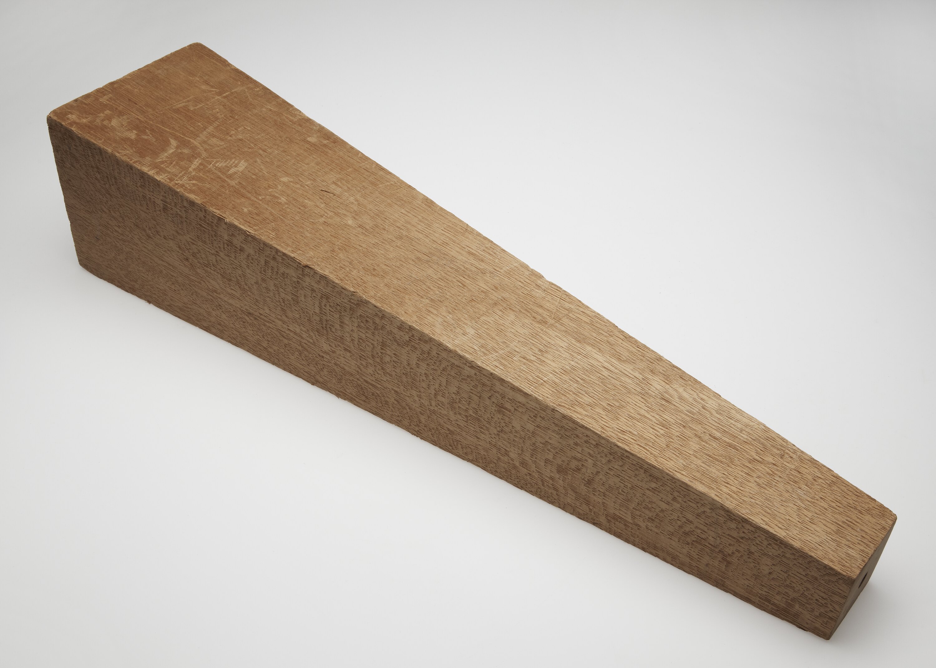 Partially worked piece of wood, gold in colour and cut into a pyramid shape. A circular channel penetrates the body of the wood via the centre of the top. A similar circular channel is present in one corner of the base.