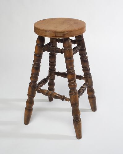 Wooden stool with turned legs created by Adolph Bruhn & Son, circa 1970 - 1990. It was taken from Area A at Adolph Bruhn & Son's Wood Turners Shop, 283 Coventry Street, South Melbourne. The business was established by Adolph Bruhn circa 1893 in Little Collins Street, Melbourne. Upon his death in 1919 it was then operated by Adolph's son Sophus Christopher Bruhn. Upon Sophus's death in 1959 his son Sophus Walter Bruhn took over the business. In 1970 Sophus reduced the scale of the business and relocated to South Melbourne. The business closed upon Sophus's death in January 1990.