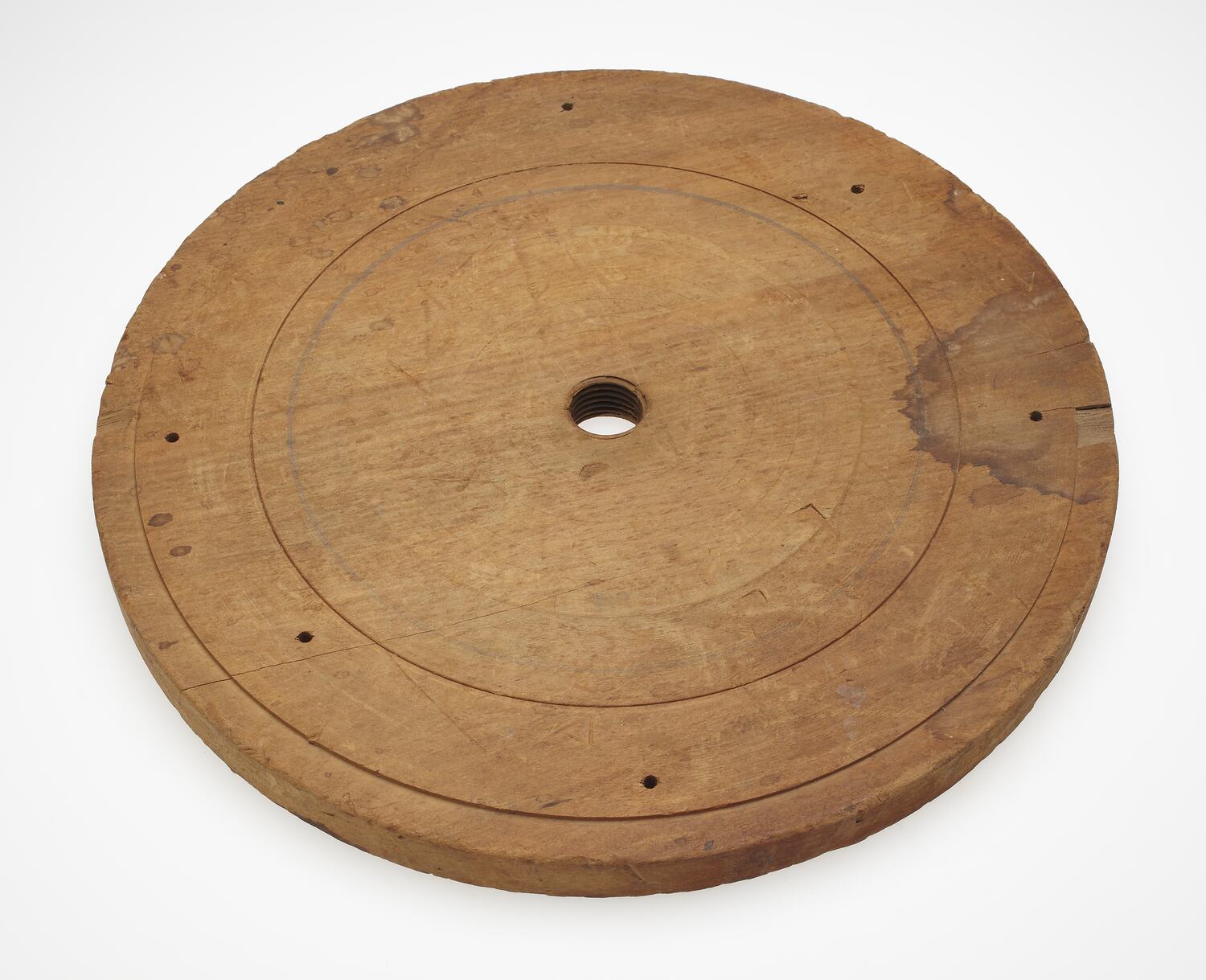 Large, round, thick disc made from gold-coloured wood. Front of disc has multitudes of circular striations that differ in thickness and depth and which run parallel to one another. A circular hole with screw-like inner sides is present in centre of disc. Six smaller holes penetrate the disc and are located at regular intervals close to the edge.