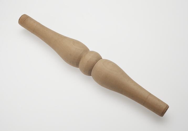 Turned wooden furniture leg created by Adolph Bruhn & Son, circa 1970 - 1990. It was taken from Area A at Adolph Bruhn & Son's Wood Turners Shop, 283 Coventry Street, South Melbourne. The business was established by Adolph Bruhn circa 1893 in Little Collins Street, Melbourne. Upon his death in 1919 it was then operated by Adolph's son Sophus Christopher Bruhn. Upon Sophus's death in 1959 his son Sophus Walter Bruhn took over the business. In 1970 Sophus reduced the scale of the business and relocated to South Melbourne. The business closed upon Sophus's death in January 1990.