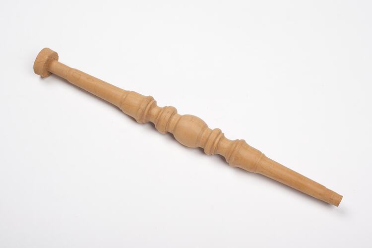 Wooden furniture spindle created by Adolph Bruhn & Son, circa 1970 - 1990. It was taken from Area A at Adolph Bruhn & Son's Wood Turners Shop, 283 Coventry Street, South Melbourne. The business was established by Adolph Bruhn circa 1893 in Little Collins Street, Melbourne. Upon his death in 1919 it was then operated by Adolph's son Sophus Christopher Bruhn. Upon Sophus's death in 1959 his son Sophus Walter Bruhn took over the business. In 1970 Sophus reduced the scale of the business and relocated to South Melbourne. The business closed upon Sophus's death in January 1990.